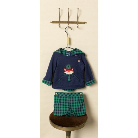 Sudadera en color azul marino con estampación central de cara de zorro rematado con bonito pompón de pelo verde en su cabeza. Con bolsillo canguro bajo esta estampación.Cuenta con 2 botoncitos de madera en el hombro izquierdo que facilitan el cambio. Capucha y remate en mangas en tejido de cuadro escocés a juego de tonos verdes y azules.