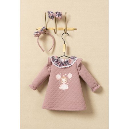 Vestido rosa empolvado de la colección La Casa de la Magia 25733-1 Basmarti de corte trapecio que sienta genial en cualquier tipo de cuerpo.Tejido guateado con estampación de hada central.cuenta con dos alerones/volantes en los hombros del mismo tejido del vestido.El cuello está formado por un volante de flor romántica en tonos morados y rosas y rematado por una pequeña puntilla de color blanco que da luz. Una pieza cómoda y versátil a la que podrás sacar partido durante toda la temporada.